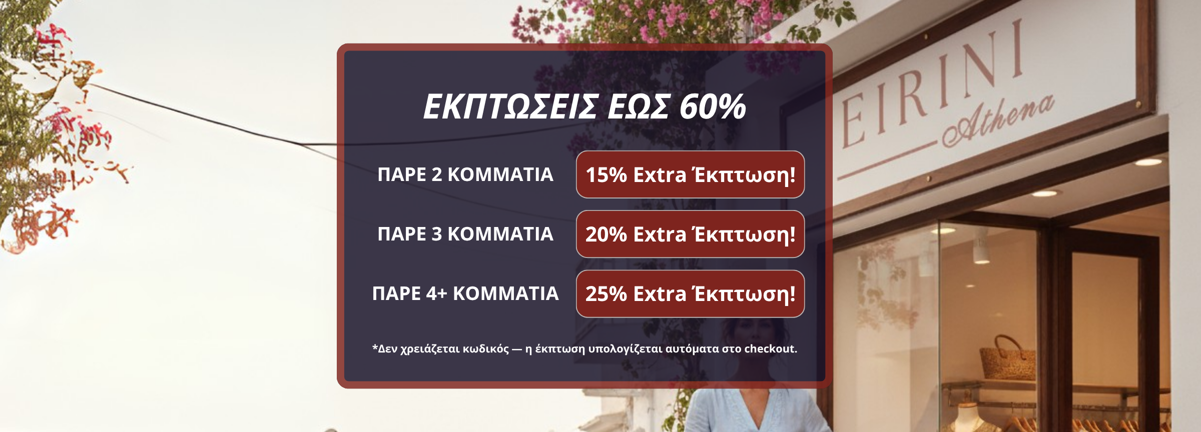 Γιορτάζουμε την επέτειό μας! 🎉 Εδώ και χρόνια δημιουργούμε με πάθος, αγάπη και φαντασία μοναδικά κομμάτια — ειδικά για εσάς. Για να το γιορτάσουμε μαζί, ξεκινάμε το Anniversary Sale μας. Επωφεληθείτε από αποκλειστικές εκπτώσεις και βρείτε τα αγαπημένα σας κομμάτια όσο διαρκούν. Σας ευχαριστούμε που είστε μέρος αυτού του ταξιδιού. 💛 Με αγάπη, Η οικογένεια EIRINI